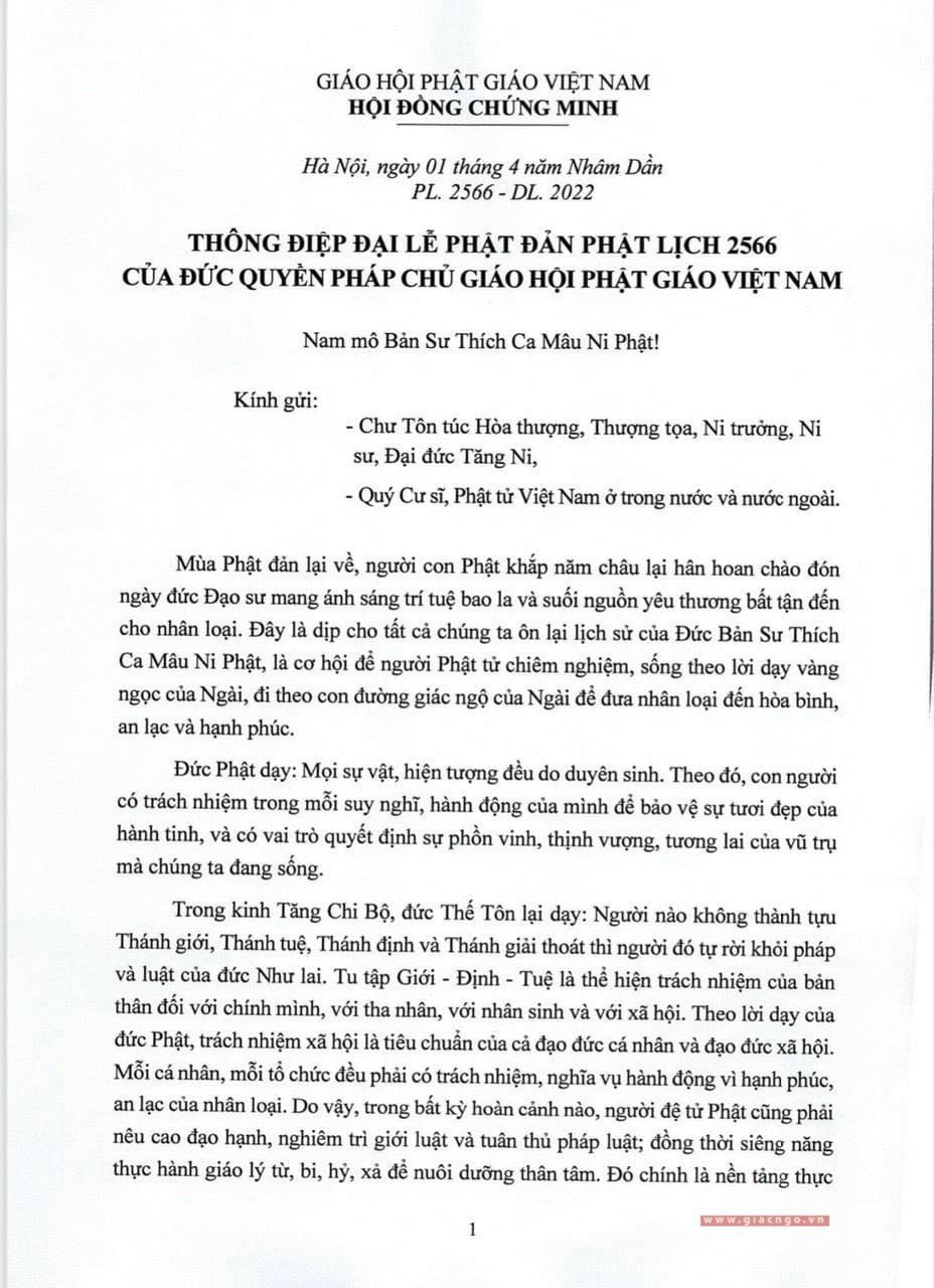 THÔNG ĐIỆP ĐẠI LỄ PHẬT ĐẢN PHẬT LỊCH 2566