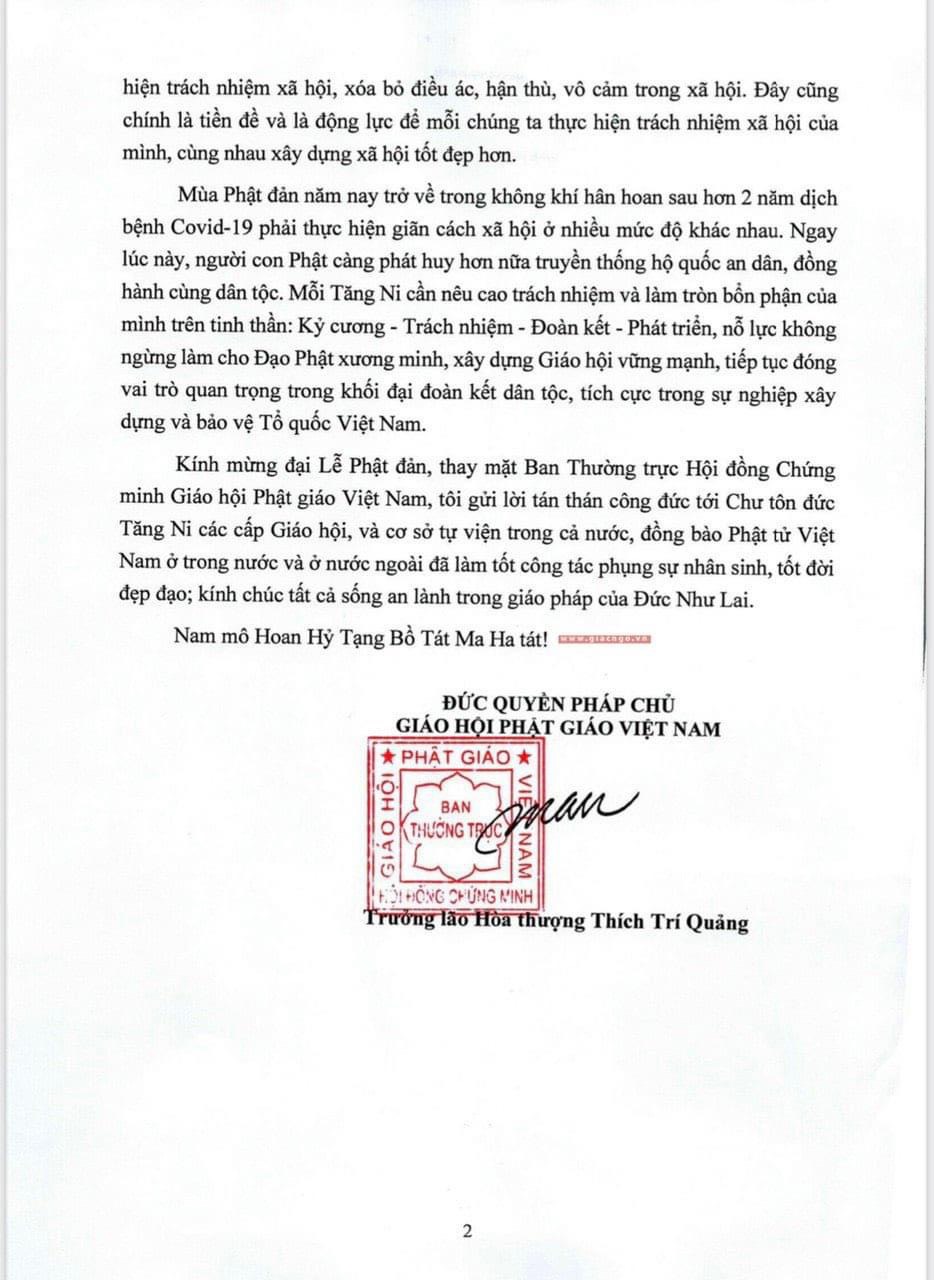 Kính mừng đại Lễ Phật đản, thay mặt Ban Thường trực Hội đồng Chứng minh Giáo hội Phật giáo Việt Nam, tôi gửi lời tán thán công đức tới Chư tôn đức Tăng Ni các cấp Giáo hội, và cơ sở tự viện trong cả nước, đồng bào Phật tử Việt Nam ở trong nước và ở nước ngoài đã làm tốt công tác phụng sự nhân sinh, tốt đời đẹp đạo; kính chúc tất cả sống an lành trong giáo pháp của Đức Như Lai!